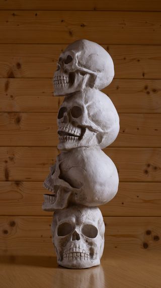 Apilamiento de cuatro calaveras decorativas, ideal para ambientar fiestas de Halloween o como pieza de arte gótico. 70cm de altura, peso 6kg. - Diseño detallado de calaveras. - Acabado en color blanco roto.