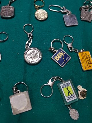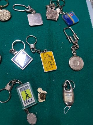 Lote de llaveros variados, perfectos para coleccionistas o para dar un toque personal. - Llavero con placa cuadrada metálica. - Llavero con diseño de bandera y escudo. - Llavero con placa rectangular metálica. - Llavero con etiqueta amarilla HIPOLITO LOPEZ GOMEZ. - Llavero con placa cuadrada azul y escudo. - Llavero con forma de medalla. - Llavero con tarjeta La Ilusión de Todos los Días ONCE. - Llavero con forma de pin. - Llavero plateado con detalle de corte. Hay 23 llveros
