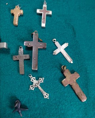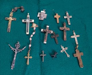 Lote de 15 cruces y crucifijos de diferentes estilos y materiales. - Incluye un rosario con cuentas. - Variedad de diseños, algunos con figuras religiosas. - Piezas decorativas y de colección.