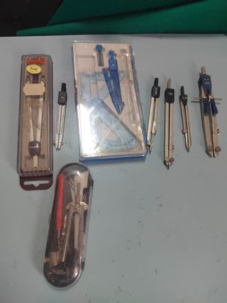 Conjunto de compases de dibujo de diferentes marcas y modelos. - Compás principal en estuche. - Compás de precisión. - Set de geometría con transportador y escuadras.