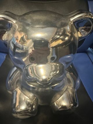 Hucha con forma de oso, acabado plateado brillante. - Diseño moderno y llamativo. - Ideal para decorar cualquier espacio.
