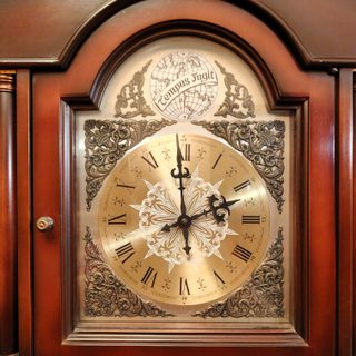 El reloj está fabricado predominantemente en madera oscura, con detalles dorados en la esfera y las pesas. Presenta un estilo clásico con un copete arqueado y remates decorativos en la parte superior. Cuenta con un mecanismo de carrillón y pesas, visible a través de la puerta de cristal inferior, que suelen colgar de cadenas o cables. La esferalleva la inscripción "Tempus Fugit". Medidas: 203x40x27. No utiliza baterías, sino simplemente el movimiento pendular y las pesas aunque estan atascadas. Hay que recogerlo en Santurce