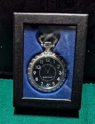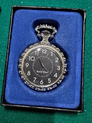 Elegante reloj de bolsillo con cuerda manual, listo para estrenar. Presentado en una caja. - Diseño clásico. - Esfera con números arábigos. - Cadena para colgar.