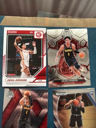 Conjunto de 4 cromos de Jalen Johnson, jugador de baloncesto. - Incluye cromos de diferentes colecciones. - Ideal para coleccionistas de la NBA.
