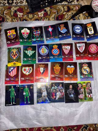 Lote de cromos de fútbol de la colección Megacracks 25-26. Incluye escudos de equipos, cromos de jugadores de la serie Carreras y cromos Flash. - Cromos de la temporada 25-26. - Incluye escudos de equipos. - Cromos de la serie Carreras. - Cromos de la serie Flash. - Cromos de la serie Oblack.