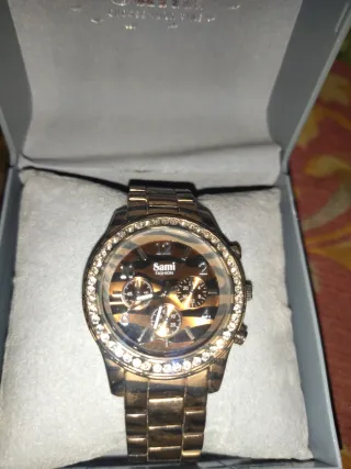 Elegante reloj de pulsera de la marca Sami Fashion. Su diseño combina un estilo moderno con detalles brillantes. - Bisel adornado con circonitas. - Esfera con detalles en tonos marrones y dorados. - Correa metálica a juego. -Está nuevo en su caja