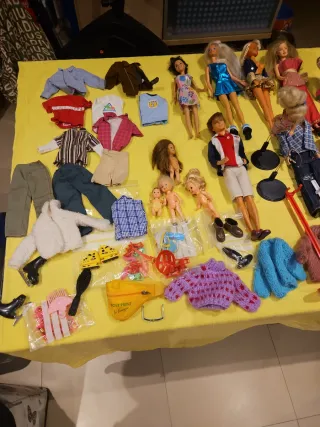 Lote de 12 muñecos de colección, incluyendo figuras de Barbie, Ken y Chelsea. - Muñecos de los años 80. - Variedad de ropa y accesorios incluidos.