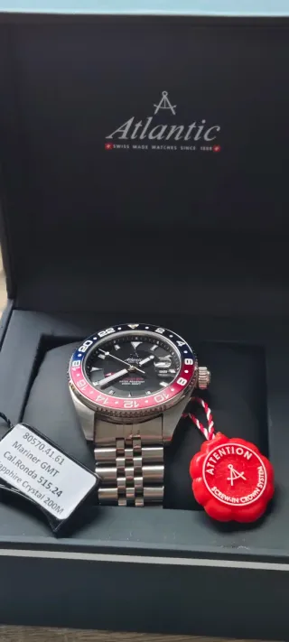 Reloj Atlantic Mariner GMT con bisel giratorio de dos tonos. -Tamaño reloj 45mm. - Bisel GMT con marcadores de 24 horas.No cambio ni devolución. - Esfera azul y rojo. Cristal zafiro. - Indicador de fecha. - Correa de acero inoxidable -Correa de piel de repuesto. - Resistencia al agua de 200M/660FT.Reloj cuarzo.