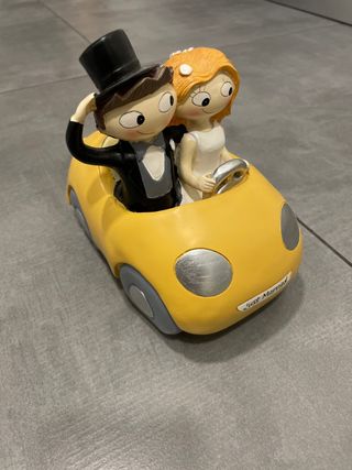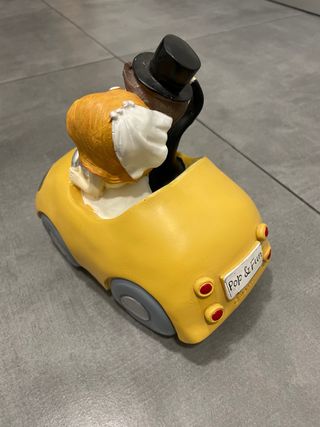 Figura decorativa para tarta de novios en un coche amarillo con el lema Just Married. Ideal para bodas. - Diseño divertido y original. - Incluye novio con sombrero y novia. - Coche con detalles plateados.