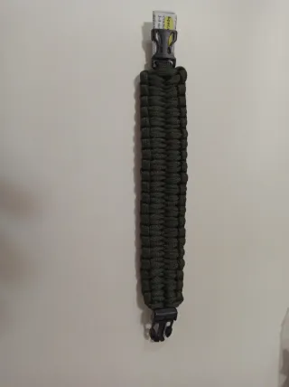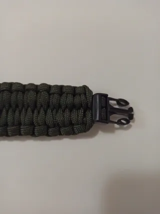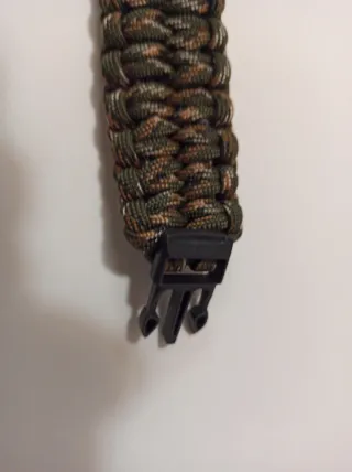 Pulsera de paracord con hebilla de liberación rápida. - Diseño trenzado en camuflaje militar. - Hebilla de plástico resistente.
