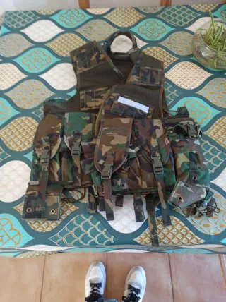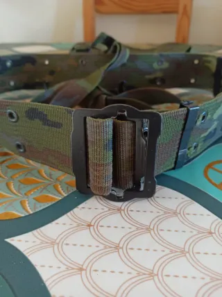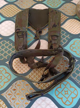 Correaje y trinchas, utilizado por el Ejército de Tierra. - Diseño de camuflaje militar. - Hebillas y enganches de metal negro.