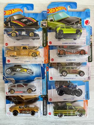 Colección de 8 coches Hot Wheels variados. - Porsche 935 - La Troca - 73 Honda Civic Custom - McLaren F1 GTR - Volkswagen Beetle - Motocicleta - Camioneta - Coche deportivo negro