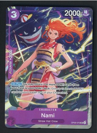 Carta de personaje Nami del juego de cartas One Piece. - Número de carta: OP09-070 - Tipo: Personaje - Afiliación: Sombrero de Paja - Coste: 3 - Poder: 2000 - Contra: +2000 - Habilidad: Al entrar en juego - Puedes devolver 1 o más cartas DON!! de tu campo a tu mazo DON!!: Otorga hasta 2 cartas DON!! boca abajo a tu Líder o 1 de tus Personajes.