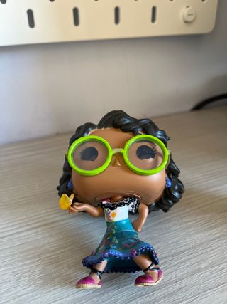 Figura Funko Pop de Mirabel del universo Encanto. - Detalle de mariposa en la mano. - Gafas verdes características. - Vestido colorido con diseño floral.