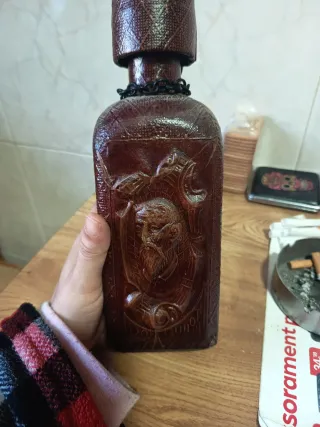 Botella antigua con un diseño grabado. - Representación de Don Quijote. - Tapa con detalles. - Cadena decorativa.