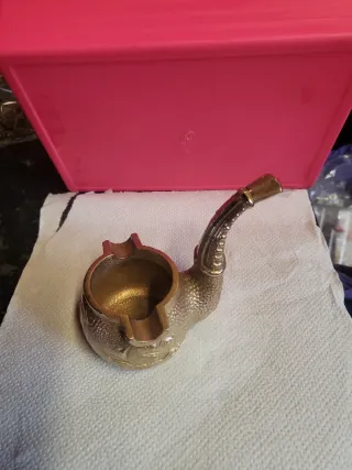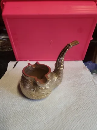 Original cenicero con forma de pipa antigua. - Fabricado en bronce. - Diseño detallado con figura. - Ideal como objeto decorativo.