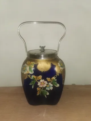 Precioso galetero o bombonera de estilo modernista con un diseño llamativo. - Cuerpo de cristal azul cobalto. - Decoración floral pintada a mano. - Detalles en pan de oro. - Asa y tapa metálicas.