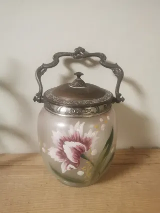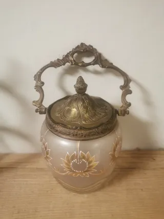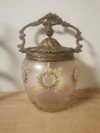Preciosa bombonera o galletero de estilo Modernista, con un diseño floral muy decorativo. - Cuerpo de cristal esmerilado. - Decoración pintada a mano con flores y motivos dorados. - Tapa y asa metálicas ornamentadas.