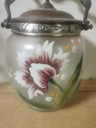 Precioso galletero o bombonera de estilo Modernista, con un diseño floral pintado a mano. - Cuerpo de cristal esmerilado. - Tapa y asa de metal con detalles ornamentales. - Pintura de flor y hojas en tonos morados, blancos y verdes.
