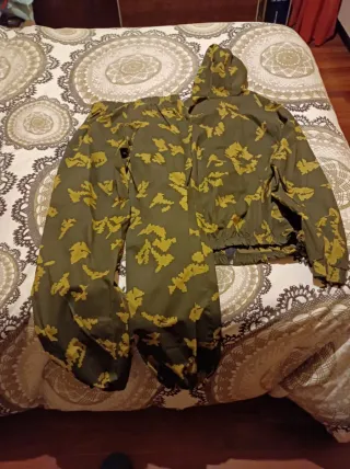 Conjunto de uniforme con estampado de camuflaje Berezka gold. Sin uso. Talla 50(L). Para colocar encima del uniforme de faena y proporcionar camuflaje. Versión ligera verano - Chaqueta con capucha y cremallera. - Pantalones con bolsillos.