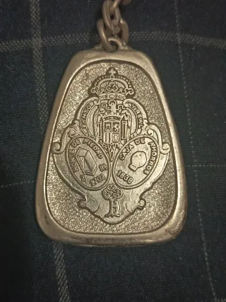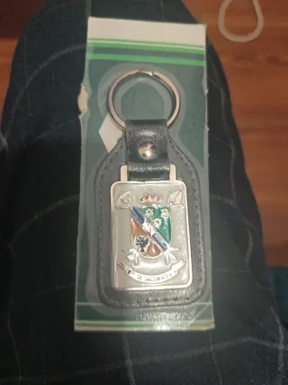 Llavero conmemorativo del Regimiento de Ingenieros. - Diseño de escudo con corona. - Detalle de espadas y flores. - Inscripción en la parte inferior.