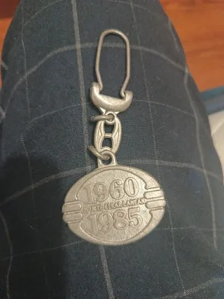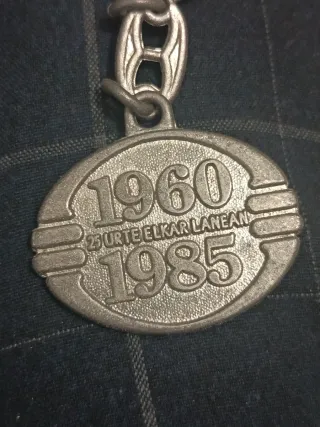 Llavero conmemorativo de 25 años de trayectoria. - Diseño ovalado con relieve. - Inscripción 1960 25 URTE ELKAR LANEAN 1985. - Cadena y anilla metálicas.