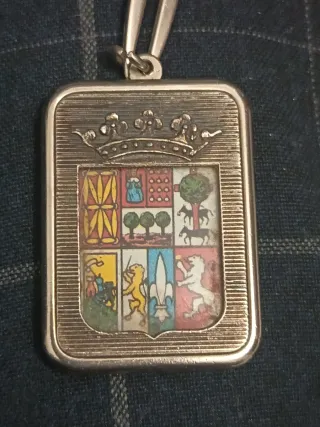 Llavero antiguo con escudo de Euskalerria de los años 70. - Diseño rectangular con detalles en relieve. - Escudo central con múltiples divisiones y motivos. - Colgante metálico con cadena.