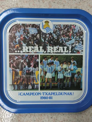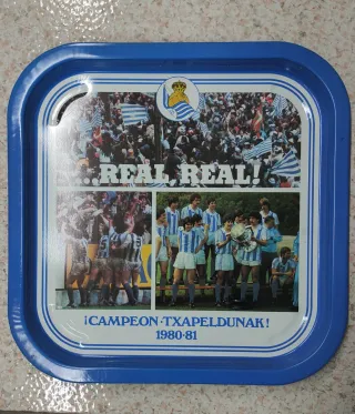 Bandeja metálica conmemorativa del Real Sociedad, temporada 1980-81. - Diseño con imágenes del equipo y aficionados. - Texto ¡CAMPEON TXAPELDUNAK! y 1980-81. - Borde azul. Está nueva y ha estado guardado . Hago envíos Txuri urdin