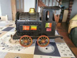 Locomotora de hojalata antigua de la marca Paya, modelo Tostafrut, de los años 60. Presenta detalles decorativos con banderas de Dinamarca, Etiopía y México. -incluye en su interior un pequeño horno para tostar frutos secos o hacer palomitas - Fabricada en hojalata. - Diseño de locomotora. - Decoración con banderas. - Ruedas de color rojo y dorado.
