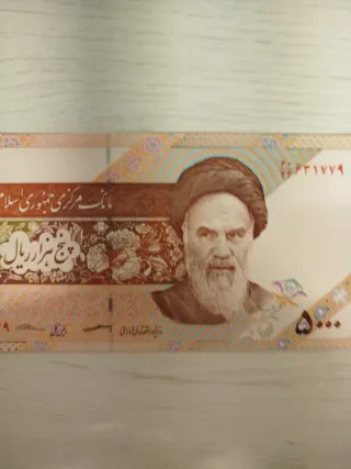 Billete de 5000 s de Irán. Presenta el retrato de Ruhollah Jomeini. - Diseño detallado con motivos islámicos. - Serie numérica visible.