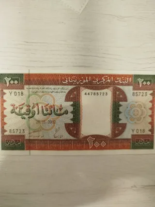 Billete de 200 Ouguiya de Mauritania con fecha de 28.11.2002. - Denominación: 200 Ouguiya - Banco Central de Mauritania - Número de serie: 44785723 - Fecha: 28.11.2002