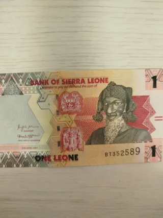 Billete de 1 Leone de Sierra Leona. Presenta un diseño distintivo con un retrato. - Banco de Sierra Leona. - Denominación: 1 Leone. - Número de serie: BT352589.
