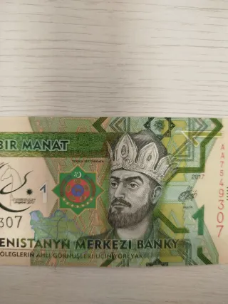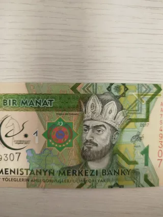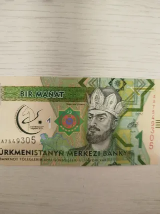 Billete de 1 Manat de Turkmenistán, emitido en 2017. Presenta un retrato de Toghrul Beg Turkmen. - Denominación: 1 Manat - Año de emisión: 2017 - País: Turkmenistán - Diseño: Retrato de Toghrul Beg Turkmen y emblema nacional.