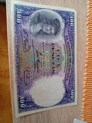 Billete antiguo de 100 pesetas del Banco de España, con fecha de Madrid del 25 de abril de 1935. - Diseño con retrato de mujer. - Firma del Gobernador y del Interventor. - Grabado de Bradbury, Wilkinson & Co. Ltd., Inglaterra. Tiene un pliegue en el centro por lo demás está muy buen estado