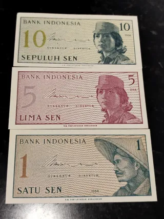 Lote de tres billetes de Bank Indonesia. - Billetes de 1 Sen, 5 Sen y 10 Sen. - Año de emisión: 1964. - Impresos por P.N. Pertjetakan Kebajoran.