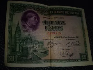 Billete de 500 pesetas del Banco de España con fecha de 15 de agosto de 1928. Presenta un retrato del Cardenal Cisneros y una vista de la Catedral de Toledo. - Emisión: 15 de Agosto de 1928 - Denominación: Quinientas Pesetas - Banco emisor: El Banco de España - Serie: 0.856.517 Estado: MBC+