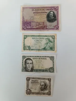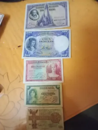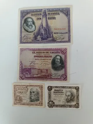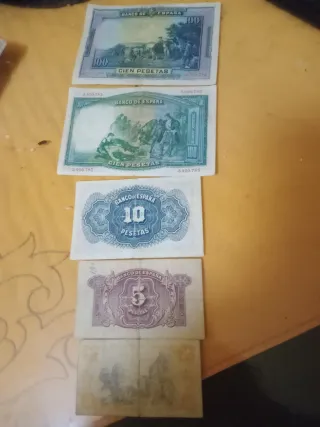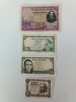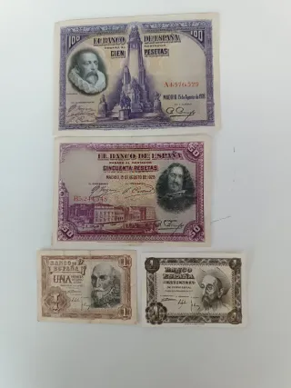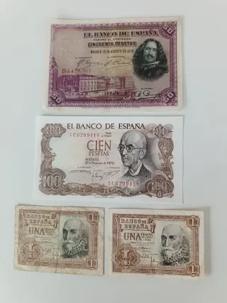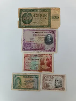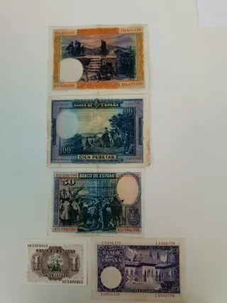 Billetes España: 100, 50, 10, 5 y 1 Pesetas
