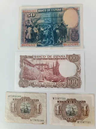 Billetes España: 50, 100 y 1 Peseta