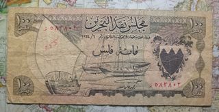 Billete de 100 fils de Bahréin, emitido en 1964. Conservación (ver fotos). Precio no negociable. Dimensiones: 118x54 (mm). Envio combinado: consultar. - Diseño con barcos y el escudo de Bahréin. - Texto en árabe e inglés.