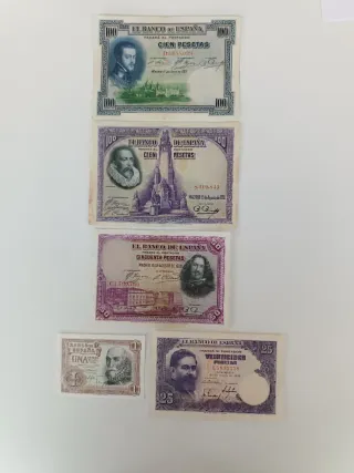 Conjunto de billetes del Banco de España. - Billetes de 100 pesetas. - Billetes de 50 pesetas. - Billetes de 25 pesetas. - Billete de 1 peseta.