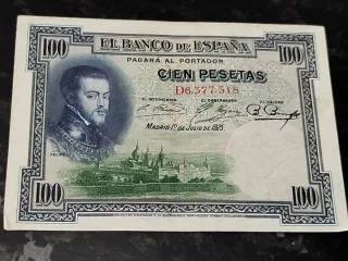 Billete de 100 pesetas del Banco de España, emitido en Madrid el 10 de julio de 1925. Presenta un retrato de Felipe II y una vista del Monasterio de El Escorial. - Serie D6.377.518 - Fecha: 10 de Julio de 1925 - Emisor: El Banco de España - Denominación: Cien Pesetas