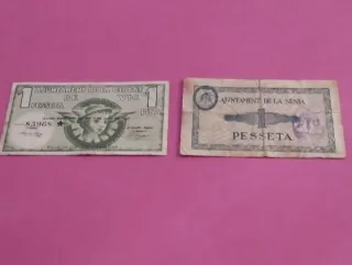 Dos billetes antiguos de pesetas de ayuntamientos españoles. - Billete de una peseta del Ayuntamiento de Vic. - Billete de una peseta del Ayuntamiento de La Senia, junio de 1937.