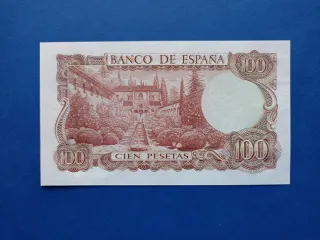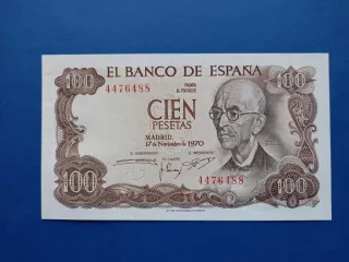 Billete de 100 pesetas del Banco de España, emitido en Madrid el 17 de noviembre de 1970. El diseño presenta el retrato de un hombre con gafas. - Denominación: 100 pesetas - Fecha de emisión: 17 de noviembre de 1970 - Lugar de emisión: Madrid - Banco emisor: Banco de España