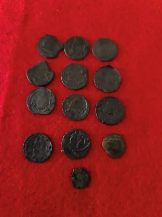 Conjunto de monedas antiguas de diferentes épocas y orígenes. Cada pieza presenta detalles históricos y diseños únicos. - Monedas con grabados y símbolos. - Materiales variados, algunos con pátina. - Piezas para coleccionistas.