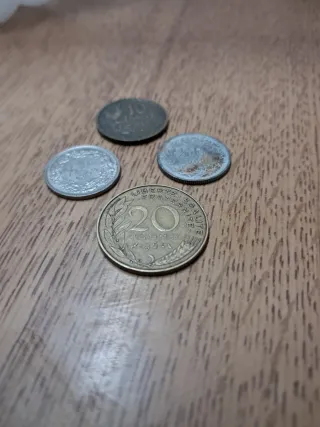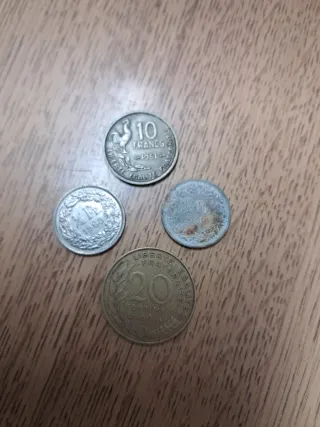 Conjunto de cuatro monedas antiguas de Francia, con diferentes valores y años. - Moneda de 10 Francos, año 1951. - Moneda de 20 Centimes, año 1964. - Moneda de 1/2 Franc, año 1968. - Moneda de 1/2 Franc, año 1968. - Moneda de 5 centimes, año 1962 #mudanza #chollo #urgente #precio negociable