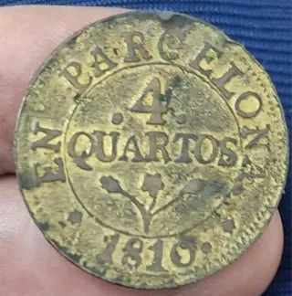 Moneda antigua de 4 cuartos de Barcelona, acuñada en el año 1810. Presenta un baño de oro de epoca. - Peso: 8,02 gramos. - Inscripción: BARCELONA 4 QUARTOS 1810. - Diseño central con flor y estrellas. 4 Cuartos Barcelona 1810. Variante de cospel grueso (Piedfort). Peso: 8,02g (Estándar ~5g). Diámetro: 25mm. Baño dorado de época. Conservación EBC." Es una pieza RARISIMA que hara las delicias de mas de un entendido en esta epoca o en esta clase de monedas. Yo NUNCA he visto una moneda asi por lo que deberia ser uns gran oportunidad para los coleccionistas. ESCUCHO OFERTAS 636 91 44 43 jose luis