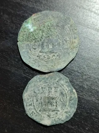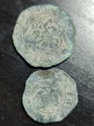 Se vende lote de dos monedas antiguas. 4 y dos maravedís de los reyes católicos Admiten limpieza POR LA COMPRA DEL LOTE DE DOS MONEDAS SE REGALA EL BOTON DE PLATA CON ASPAS Y TROCITO DE PLATA DE LA TERCERA FOTO - Monedas de bronce con pátina. - Diseño con escudo y texto. - Ideal para coleccionistas.