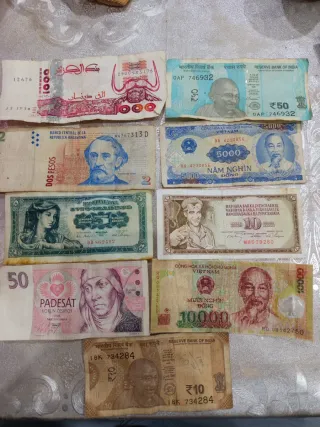 Colección de billetes antiguos de diferentes países. Cada billete tiene un diseño único y representa una época. - Billetes de Argelia, India, Argentina, Vietnam, Yugoslavia y Checoslovaquia. - Diseños variados con retratos y monumentos. - Diversos valores y fechas.