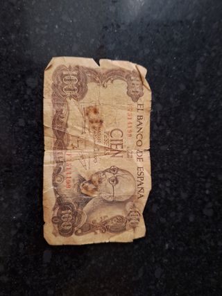 Billete antiguo de 100 pesetas del Banco de España, con fecha de 19 de noviembre de 1965. Presenta un retrato de Gustavo Adolfo Bécquer. - Denominación: 100 pesetas. - Emisor: Banco de España. - Fecha de emisión: 19 de noviembre de 1965. - Serie: G2441821.