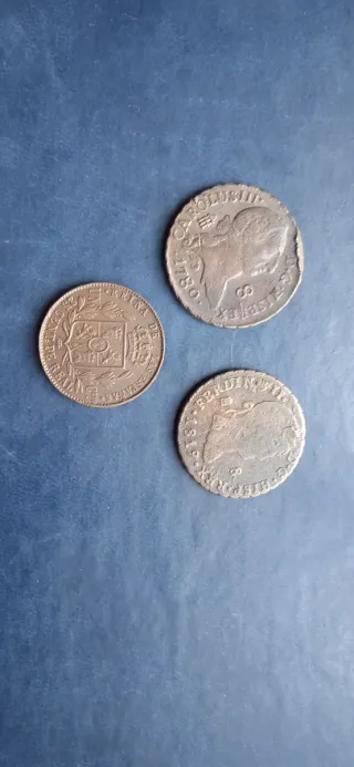 Conjunto de tres monedas antiguas. - Una moneda con escudo y corona. - Una moneda con perfil de rey y año 1780. - Una moneda con perfil de rey y año 1781.
